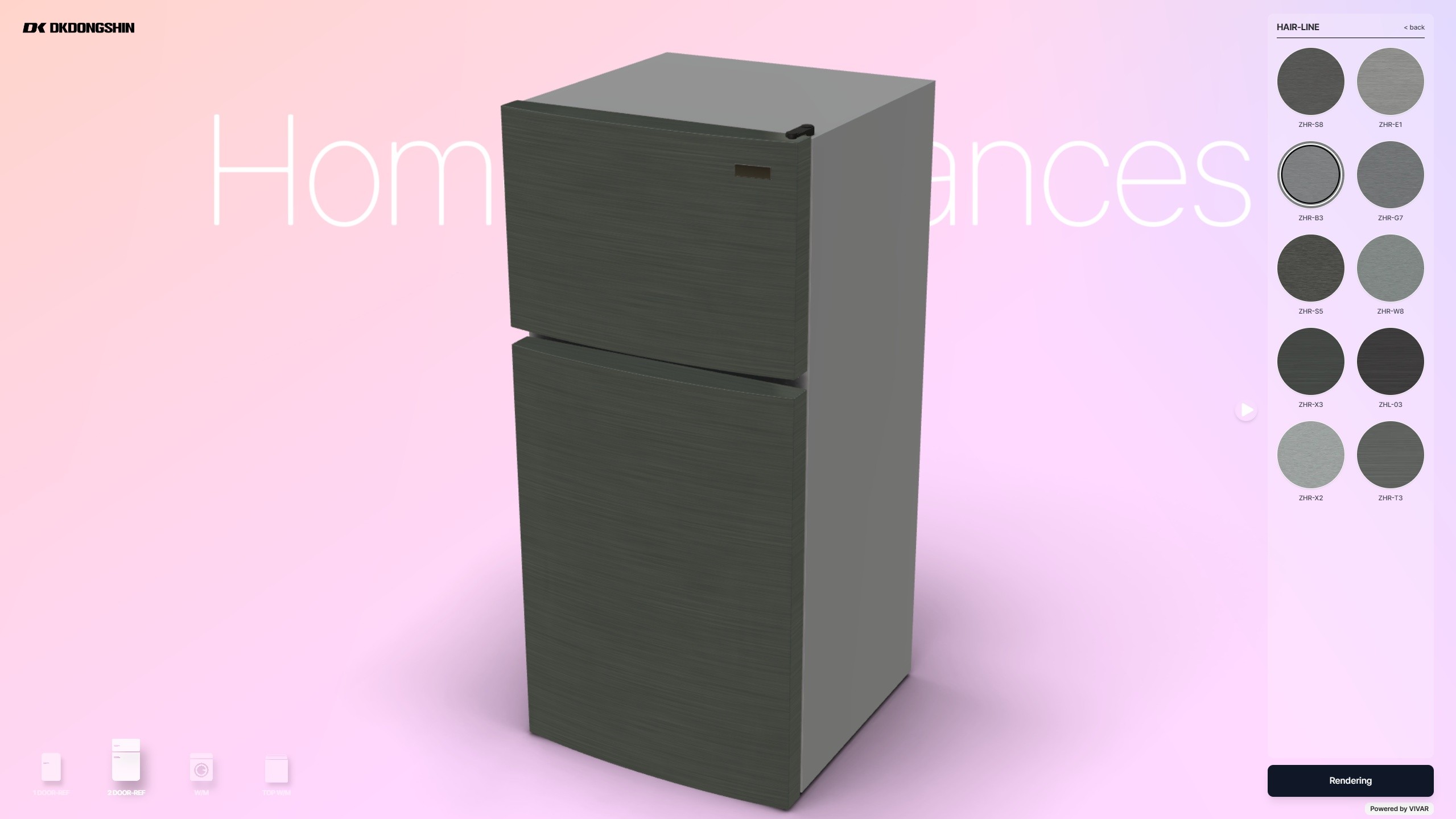 디케이동신의 냉장고, 세탁기, 식기세척기 등 가전제품 외장 패널에 적용될 필름 소재와 패턴, 컬러를 3D 상에서 즉시 바꿔 보며 완성 이미지를 확인할 수 있습니다. 영업 담당자는 고객 상담 중 여러 조합을 한 화면에서 비교·설명할 수 있어, 별도의 시안 작업 없이도 원하는 느낌과 톤을 빠르게 맞춰가는 제안이 가능합니다.