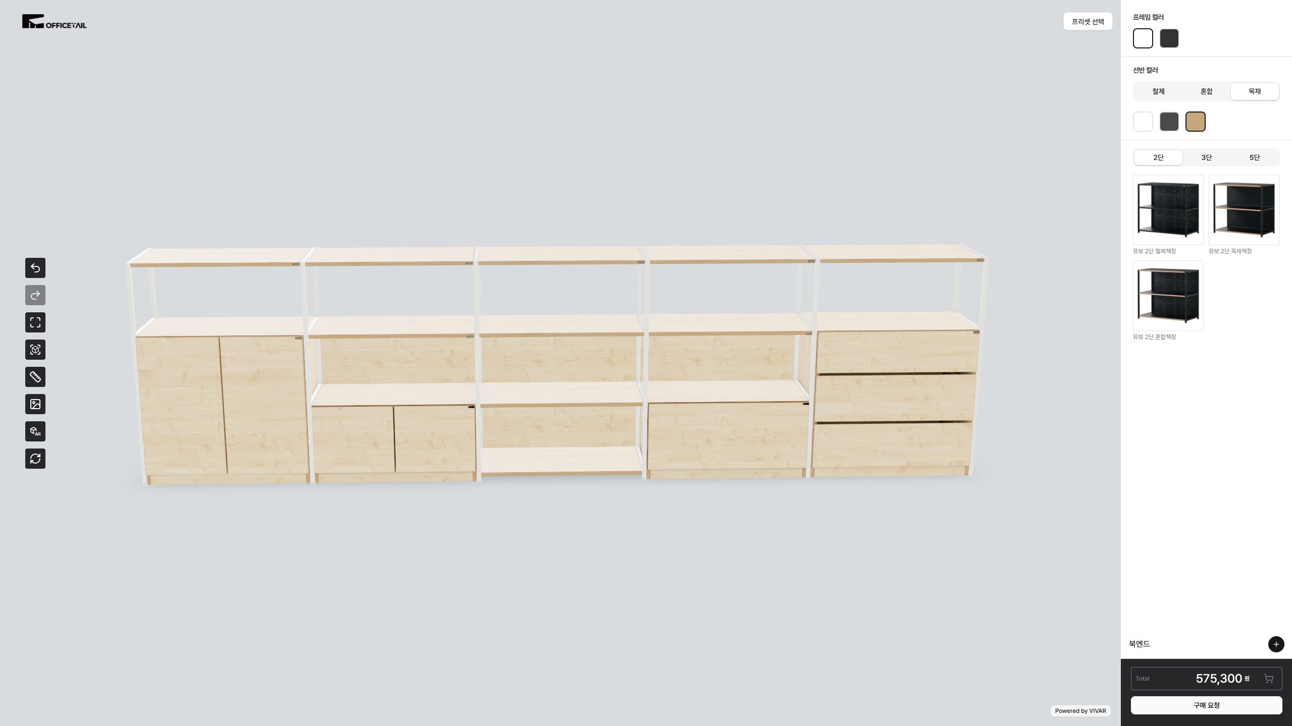 TOFAS 컨피규레이터는 프레임 색상 변경, 목재 및 금속 소재 선택, 선반 구성 변경, 하부장 타입 선택 등 주요 옵션을 자유롭게 설정할 수 있도록 설계되었습니다. 사용자는 일반 사무실, 회의실, 임원실, 쇼룸, 공유오피스, 매장 집기 공간 등 다양한 환경에 맞춰 제품을 직접 구성할 수 있습니다. 선반 내부 조명 옵션도 즉시 반영되어 전시 효과, 분위기 연출, 실사용 편의성까지 미리 확인할 수 있습니다. 낮은 수납형 구조, 개방형 선반 구조, 진열형 디스플레이 구조 등 목적에 따라 레이아웃 변경도 가능합니다. 모든 옵션은 생산 가능 조건을 기준으로 자동 검증되어 비현실적이거나 제작 불가능한 조합은 시스템이 즉시 제한합니다.