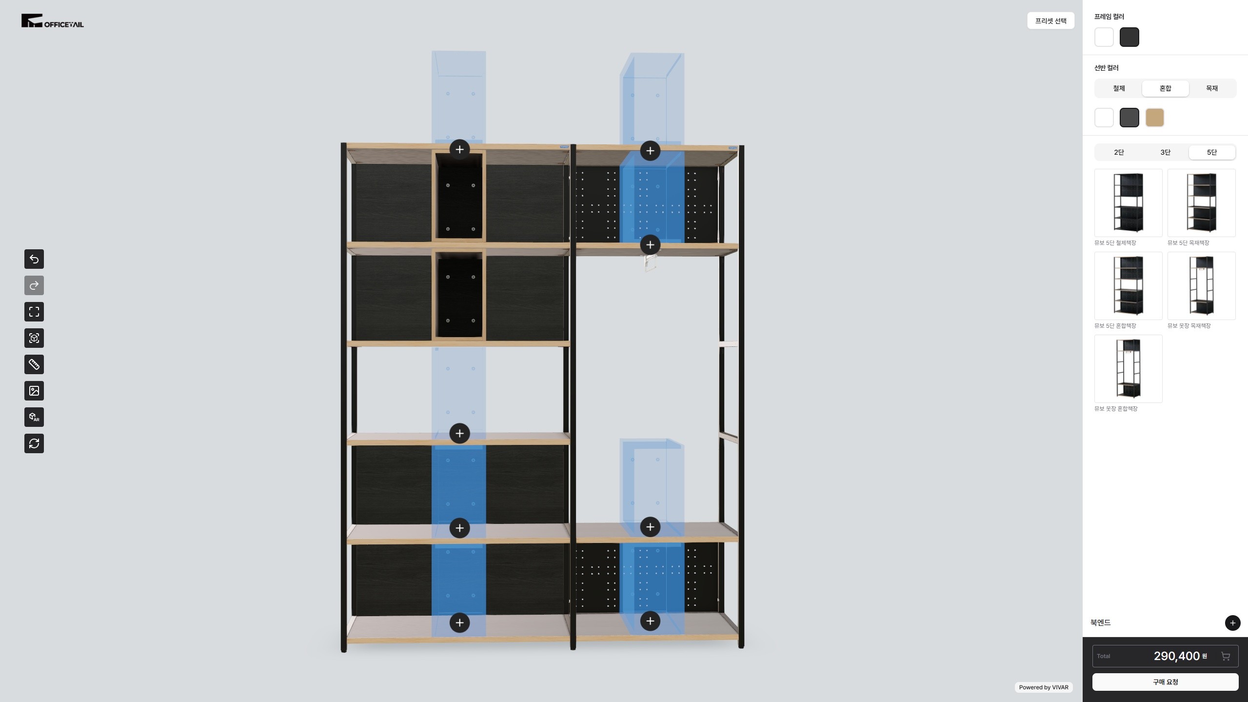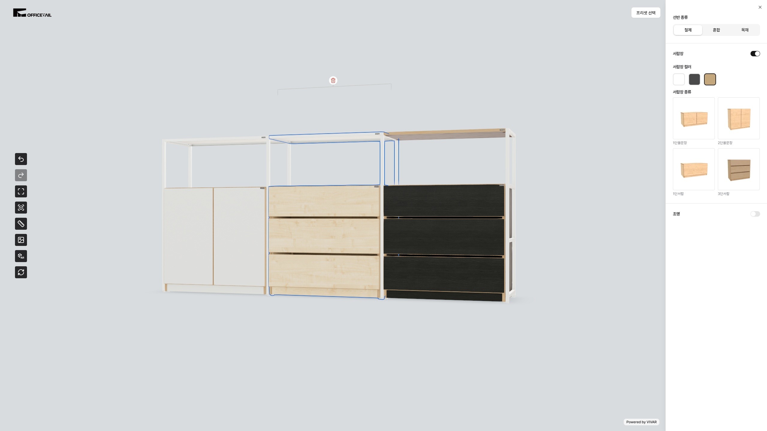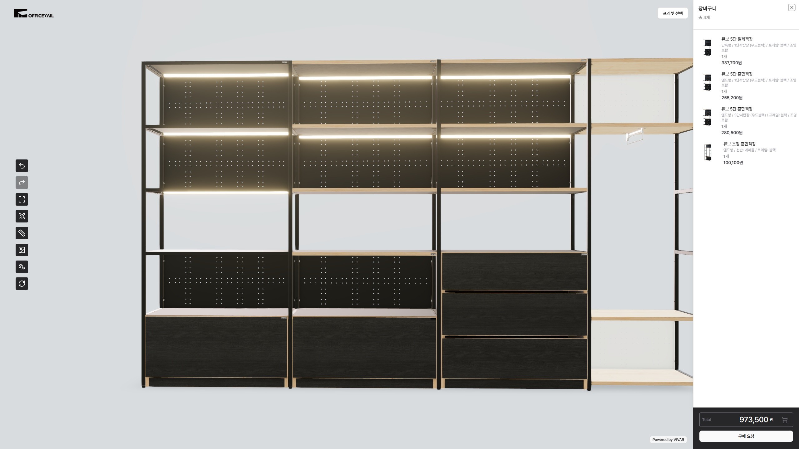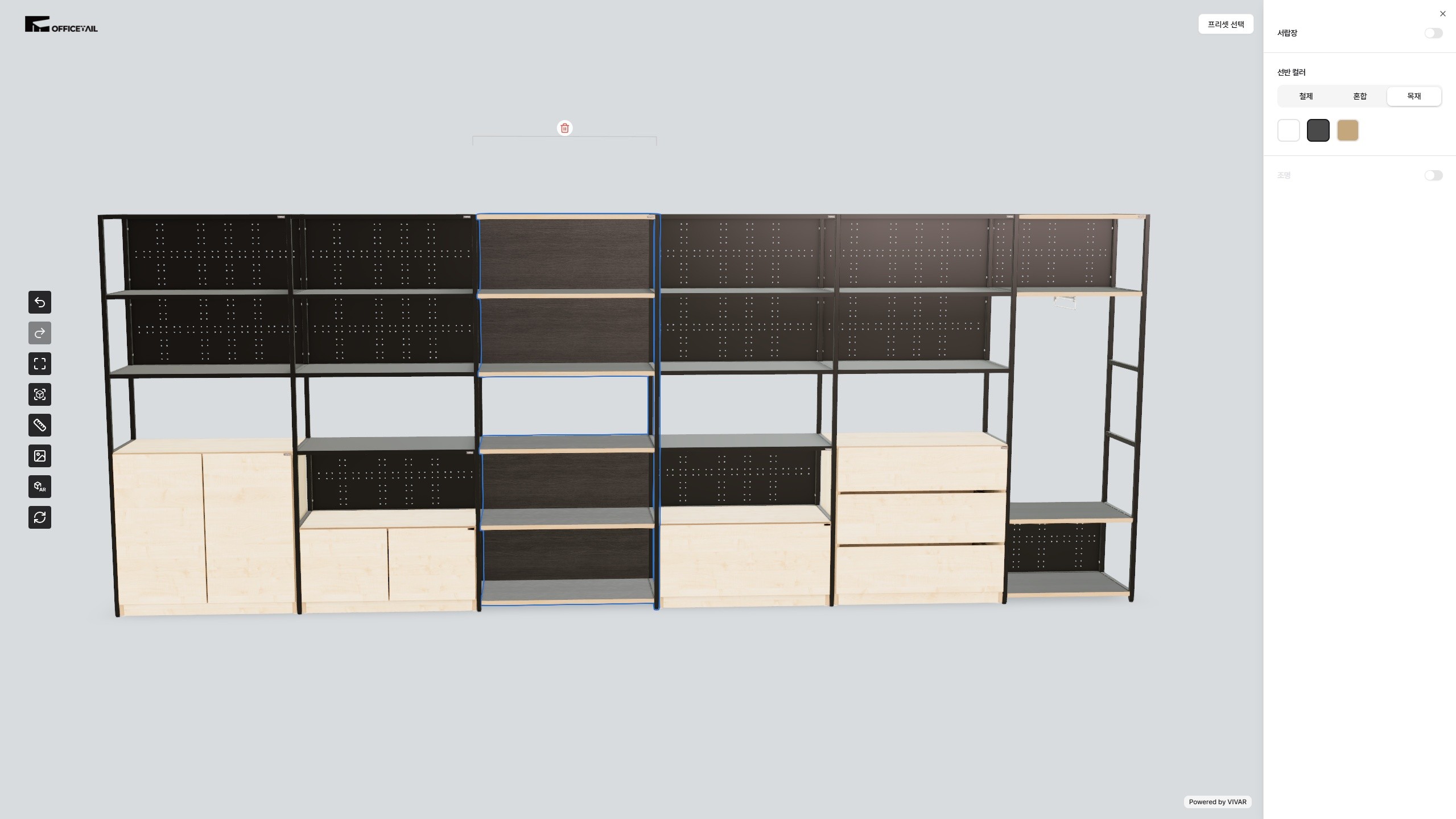 3D 화면에서 모듈형 사무용 가구를 직접 구성할 수 있습니다. 선반 크기, 컬러, 하부장, 조명 옵션까지 실시간으로 반영되어 사무실 공간에 맞는 가구를 손쉽게 설계할 수 있습니다.